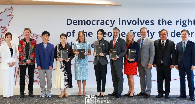 한편, 김 여사는 간담회 전에 데이먼 윌슨 NED 회장의 안내로 기관을 둘러보며 현황 설명을 청취했다. NED는 전 세계 민주주의 증진을 위해 1983년 미국 의회가 설립한 초당파 비영리 독립단체로, 1990년대부터 꾸준하게 북한인권 단체들의 활동을 지원해 왔다.