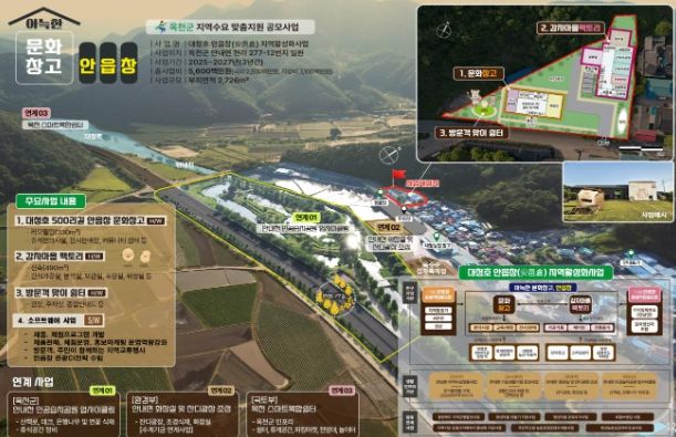 ‘아늑한 문화창고 안읍창’을 모토로 삼고 있는 이 사업은 2025년부터 3년간 국비 25억을 포함한 총사업비 56억을 투입해, 안내면 현리 277-12번지 일원의 양곡창고 리모델링을 통해 카페, 전시판매장 등의 커뮤니티 공간인 문화창고를 조성하고, 지역 농특산물을 활용해 방문객의 입맛을 사로잡는 먹거리 개발을 위한 감자마을 팩토리를 신규 조성한다.