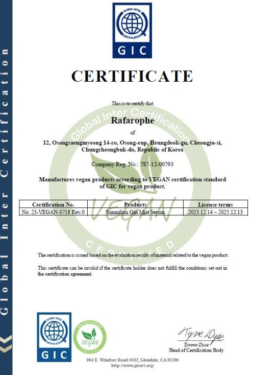 앞서 인삼뷰티케어 ‘순미한(SUNMIHAN)’브랜드 화장품 중 증평군과 협업해 개발한 ‘순미한 진 미스트 세럼’은 지난해 12월 미국 GIC 비건(GIC Vegan) 인증을 획득한 바 있다.