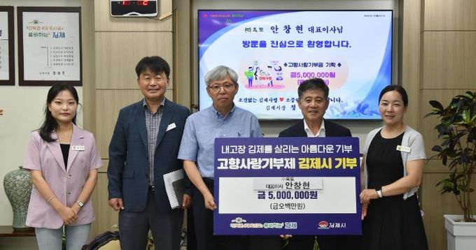 정성주 김제시장은 “김제를 향한 관심과 애정으로 고향사랑기부를 실천한 안창현 대표이사와 김광진 이사장에 감사드린다”며 “고향사랑기부금은 김제 발전 및 김제시민의 복리 증진을 위해 소중히 사용하겠다”고 말했다.