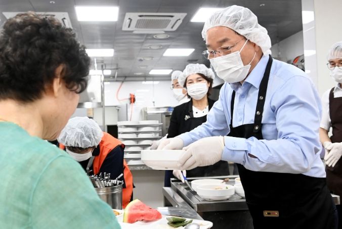 이날 유정복 인천시장과 박종효 남동구청장 등은 경로식당을 이용하는 어르신들에게 삼계탕 500인분을 배식했다.