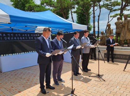 (아름다운교육신문) 강원특별자치도교육청은 15일 13시부터 14시까지 도교육청 내 희생순직교직원상 앞에서 ‘교육활동보호를 위한 교육공동체 공동선언문’을 낭독하고 교육활동 침해로 인해 순직한 교사를 추모하는 시간을 가졌다.