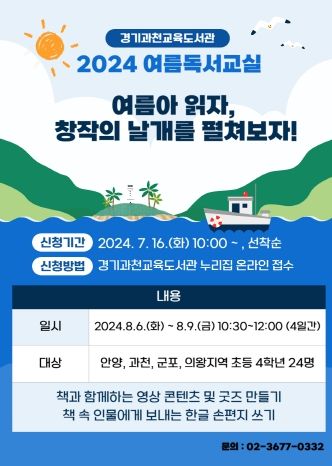 여름독서교실은 8월 6일부터 9일까지 4일간 과천·안양·군포·의왕 지역 초등학교 4학년을 대상으로 운영한다. 주요 강좌는 ▲책과 함께하는 영상 콘텐츠와 굿즈 제작 ▲아침독서와 독서노트 쓰기 ▲책 속 인물에게 보내는 손 편지 쓰기 등 독서와 체험활동 등이다.