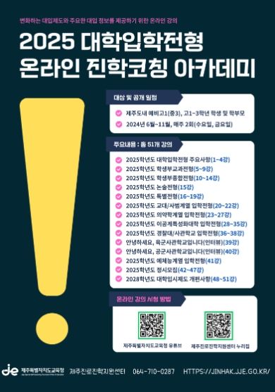 해당 온라인 강의는 2025학년도 대학입시와 2028 대학입시제도 개편 관련하여 12개 주제로 총 51개 세부 강의로 구성되어 있으며, 각 강의 영상은 매주 2회(수요일, 금요일) 제주특별자치도교육청 유튜브 채널과 제주진로진학지원센터 누리집을 통해 11월까지 순차적으로 공개될 예정이다.