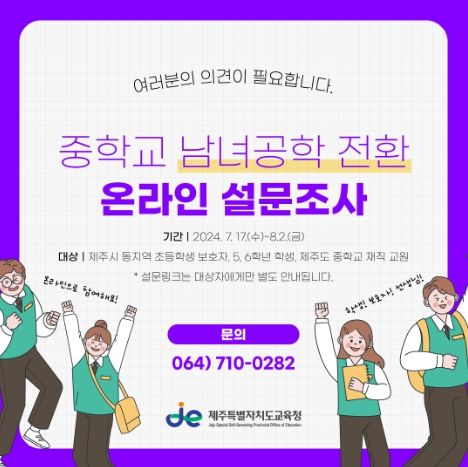 (아름다운교육신문) 제주특별자치도교육청은 7월 17일부터 8월 2일까지 ‘중학교 남녀공학 전환 설문조사’를 온라인으로 실시한다.