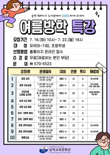 (아름다운교육신문) 삼척교육문화관은 7월 16일부터 22일까지 유아 및 초등학생을 대상으로 여름 방학 특강 수강생을 모집한다.