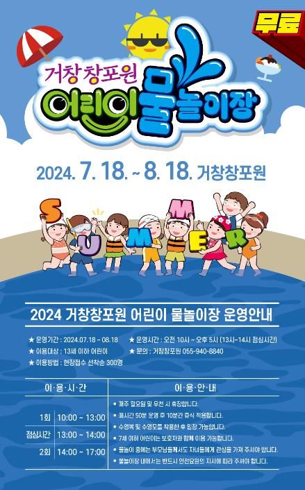 (아름다운교육신문) 거창군은 오는 18일부터 다음 달 18일까지 32일간 무더위를 날려줄 가족들의 휴식공간을 제공하기 위해 거창창포원 내 어린이 물놀이장을 운영한다.