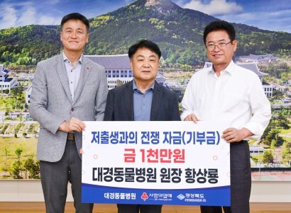 이러한 가운데 황상룡 경상북도 수의사회 수석 부회장은 15일 경북도청을 방문해 이철우 경북도지사, 손병일 경북사회복지공동모금회 사무처장 등이 참석한 가운데 저출생 극복 성금 1천만원을 전달했다.