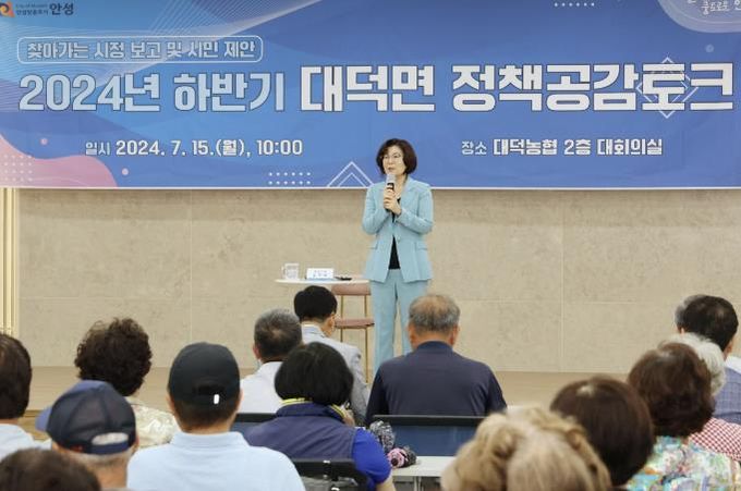 (아름다운교육신문) 안성시 대덕면은 지난 15일 대덕농협 대회의실에서 대덕면 주민들 100여 명과 김보라 안성시장이 주민과 소통하는 ‘2024년 하반기 정책공감토크’ 행사를 성황리에 마쳤다고 밝혔다.