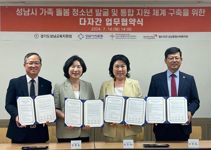 (아름다운교육신문) 성남교육지원청과 성남시의료원, 성남시 장애인가족지원센터, 월드비전 성남종합사회복지관은 16일 성남시 가족돌봄 청소년 발굴 및 통합 지원 체계 구축을 위한 다자간 업무협약을 체결했다.
