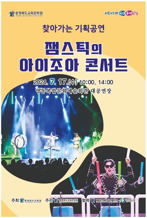 (아름다운교육신문) 충청북도교육청 직속기관 교육문화원은 17일, 지리적으로 소외된 지역의 학생들을 위해 찾아가는 기획공연 '잼스틱의 아이조아 콘서트'를 2회에 걸쳐 영동복합문화예술회관에서 초․중․고등학교 학생을 대상으로 개최했다.