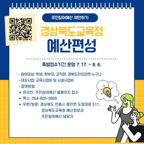 (아름다운교육신문) 경북교육청은 8월 6일까지 주민참여예산제의 일환으로 “2025년 본예산 편성을 위한 주민 의견 특별접수 기간”을 운영한다고 밝혔다.