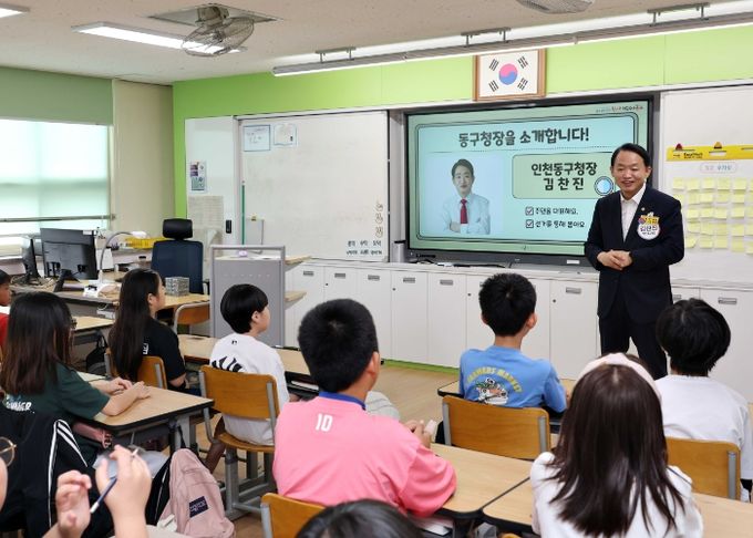 (아름다운교육신문) 김찬진 동구청장은 17일 관내 창영초등학교를 찾아 5학년 1반 학생들과 함께 ‘행복한 우리 동구 만들기’ 토론수업을 진행했다.