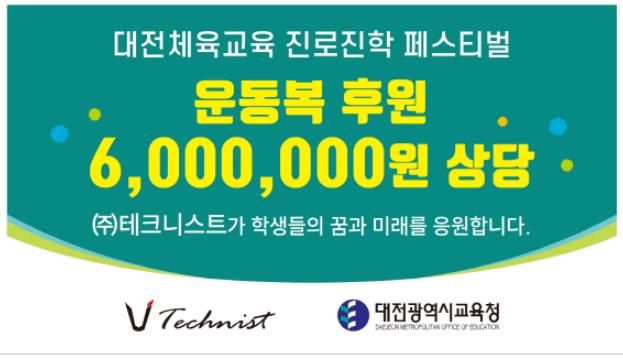 (아름다운교육신문) 대전광역시교육청은 7월 13일, 고등학생들의 체육계열 진로진학 역량 함양을 위해 유성고에서 개최된‘제2회 대전체육교육 진로진학 페스티벌’에서 스포츠 물품·의류 생산업체 ㈜테크니스트가 600만 원 상당의 운동복을, 스포츠마사지 크림 생산업체 ㈜헐커스가 230만 원 상당의 마사지 크림을 후원했다고 밝혔다.