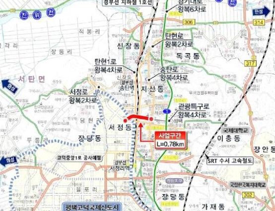 이번에 시가 발표한 사업 대상지는 ‘교보생명(송탄관광특구)~고덕국제신도시’ 구간으로, 경부선 철도로 단절된 신도시와 원도심을 잇는 역할을 하게 된다. 사업 규모는 4~6차선, 약 780m이며, 지하도로 형태로 조성될 계획이다.