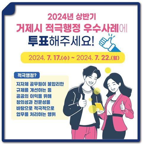 박종우 거제시장은 “시민체감도가 높은 적극행정 사례들이 우수사례로 선정될 수 있도록 이번 온라인 투표에 많은 관심과 참여를 바란다.”고 전했다.