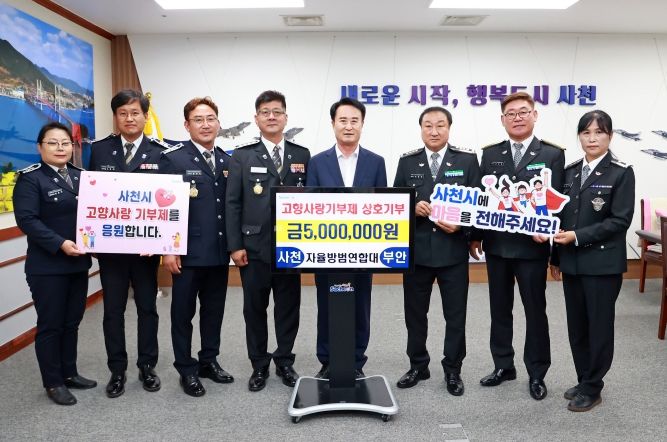 이날 곽종열 사천시 자율방범연합대장, 황현대 부안군 자율방범연합대장 등 관계자 7명이 사천시청을 방문해 고향사랑기부금 500만 원을 전달했다.