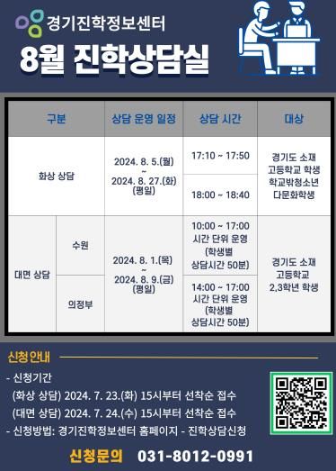 희망하는 학생은 경기진학정보센터 누리집 진학상담 신청란에서 가능하다. 화상상담은 7월 23일 15시, 대면상담은 7월 24일 15시부터 선착순으로 신청을 받는다.