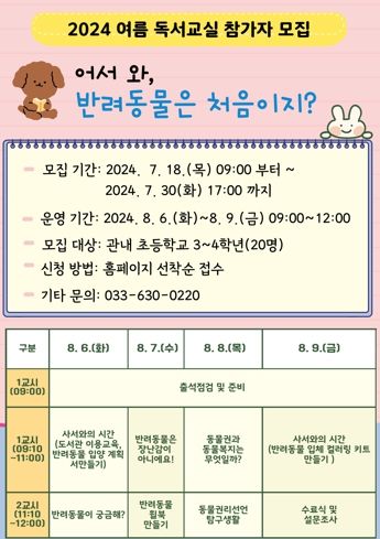 8월 6일부터 8월 9일까지 4일간 운영되는 여름 독서교실은 ‘어서 와, 반려동물은 처음이지?’를 주제로 진행된다.