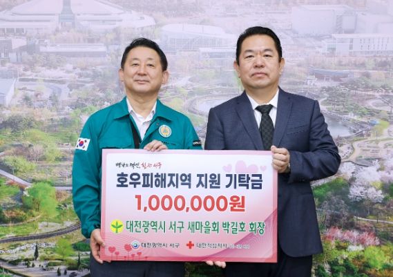 (아름다운교육신문) 대전 서구는 지난 17일 구청 갑천누리실에서 대전 서구 새마을회 박길호 회장으로부터 관내 호우 피해 지역 지원을 위한 성금 1백만 원을 대한적십자사를 통해 기탁받았다.