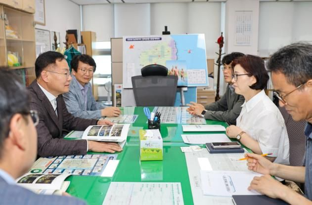 김 군수는 유정근 정책기획관, 조영숙 원장, 차순애 예산담당관. 한영희 과장 및 담당부서 팀장과 면담하며 총 사업비 350억원 규모, 9건의 사업을 설명하고 도비 지원을 적극적으로 요청했다.