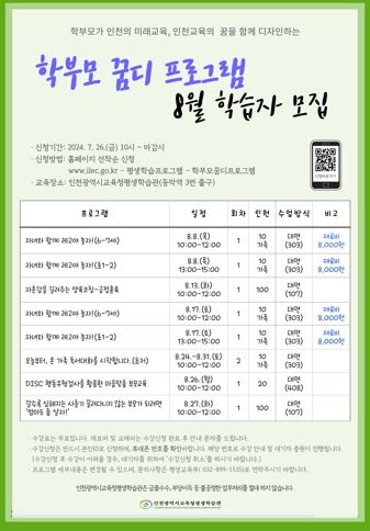 (아름다운교육신문) 인천광역시교육청평생학습관은 관내 학부모를 대상으로 8월 학부모 꿈디 프로그램 학습자를 7월 26일부터 모집한다.