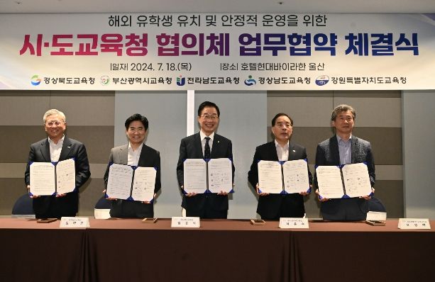 (아름다운교육신문) 경북교육청은 18일 울산광역시 호텔현대 바이라한에서 부산·전남·경남·강원교육청 등 4개 교육청과 해외 유학생 유치와 안정적 운영을 위한 업무협약(MOU)을 체결했다.