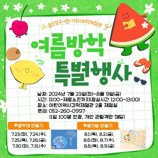 한편, 2024 여름방학 특별행사 외에도 주말 프로그램으로 7월 한 달 동안 수박 가방 및 썬캡 만들기, 8월 한 달 동안 광복절 기념 태극기 만들기 체험이 운영된다.