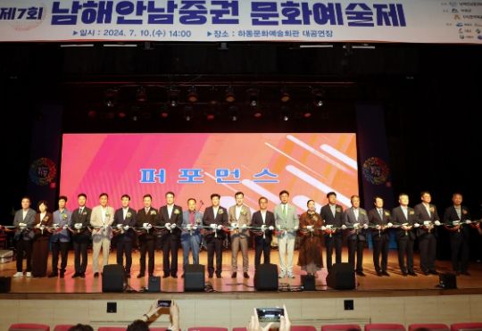 하동군립예술단의 식전 공연으로 시작을 알린 10일 개막식에는 9개 참여 시군 단체장과 지역예술인이 한자리에 모여 ‘예술로 하나 되는 남해안남중권’ 비전을 제시했다.