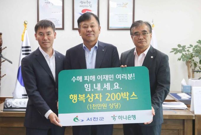 (아름다운교육신문) 지난 17일 하나은행 충청영업그룹은 서천군에 호우피해를 입은 이재민을 위해 써달라며 담요, 수건 등 긴급구호물품을 담은 행복상자 200개를 적십자를 통해 전달했다.