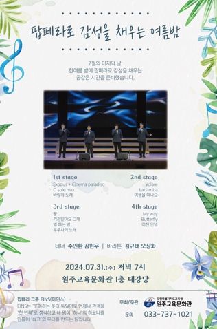 (아름다운교육신문) 원주교육문화관은 7월 31일 저녁 7시, 원주교육문화관 1층 대강당에서 무더운 여름밤에 시원한 감동을 선사할 팝페라 공연을 개최한다.