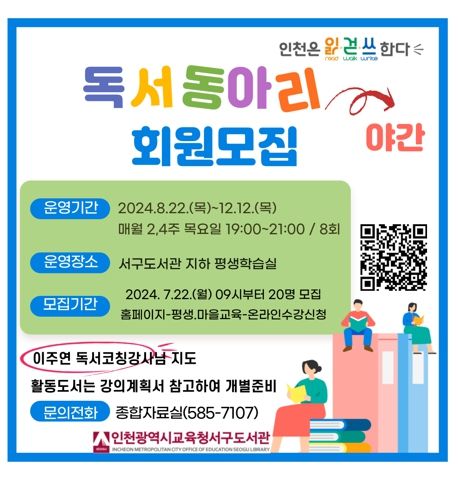 (아름다운교육신문) 인천광역시교육청서구도서관은 성인 대상 야간 독서동아리 참여자를 22일부터 모집한다.