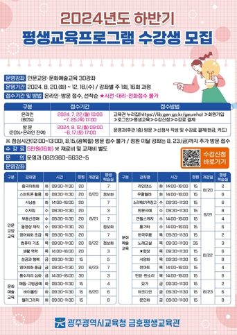 (아름다운교육신문) 금호평생교육관은 지역민을 대상으로 오는 8월부터 12월까지 운영되는 ‘2024년도 하반기 평생교육 프로그램’과 ‘광주청춘학교 프로그램’ 수강생을 선착순 모집한다.