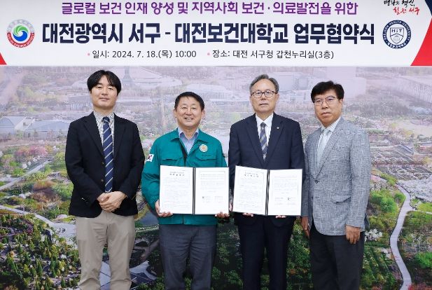 (아름다운교육신문) 대전 서구는 지난 18일 구청 갑천누리실에서 대전보건대학교와 글로컬 보건인재 양성 및 지역사회 보건·의료 발전을 위한 업무협약을 체결했다고 밝혔다.