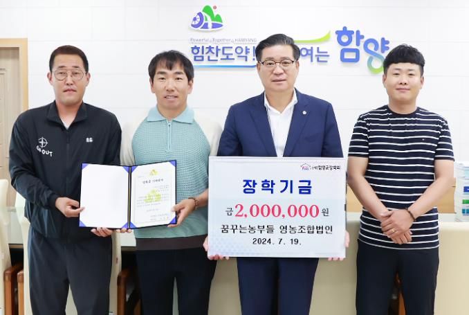 이어 함양농업을 이끌어갈 관내 청년 양파재배 농가 모임인 ‘꿈꾸는농부들 영농조합법인’도 군청을 찾아 “양파재배 소득을 뜻깊고 보람된 일에 사용하게 되어 기쁘게 생각하며, 후배들이 미래를 이끌어갈 큰 인물로 성장하는 데 도움이 되기를 바란다”라며 장학금 200만 원을 기탁했다.