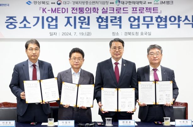 (아름다운교육신문) 경상북도는 19일 경북도청 호국실에서 ‘경상북도 ↔ 대구·경북지방중소벤처기업청 ↔ 대구한의대학교 ↔ iM뱅크’ 4자간 ‘K-MEDI 전통의학 실크로드 프로젝트 중소기업 지원 협력’ 업무협약을 체결했다.