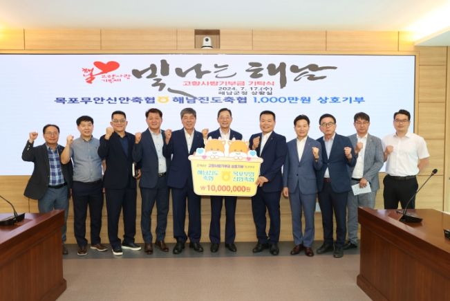17일 해남군청에서 진행된 기탁식에는 명현관 해남군수와 해남진도축협 한종회 조합장, 목포무안신안축협 문만식 조합장, 농협은행 해남군지부 김계열 지부장, 농협은행 무안군지부 김해종 지부장 등이 참석했다.