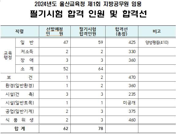 (아름다운교육신문) 울산광역시교육청은 제1회 지방공무원 임용 필기시험 합격자 78명을 교육청 누리집에 19일 발표했다.