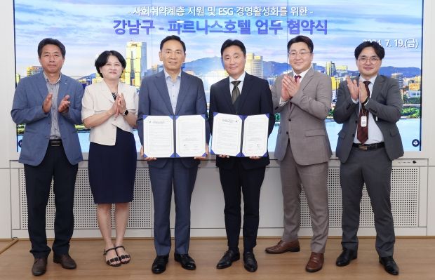 (아름다운교육신문) 꿈이 모이는 도시, 미래를 그리는 강남구가 19일 구청 본관에서 파르나스호텔과 ‘사회취약계층을 위한 공동사업 및 ESG 경영 활성화 추진 업무협약’을 체결했다.