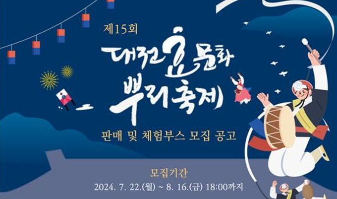 (아름다운교육신문) 대전 중구는 오는 10월 13일부터 15일까지 3일간 뿌리공원 일원에서 열리는 ‘제15회 대전효문화뿌리축제’에서 관람객들에게 다양한 프로그램을 제공하기 위해 '판매 및 체험부스'운영자를 공개모집 한다고 밝혔다.