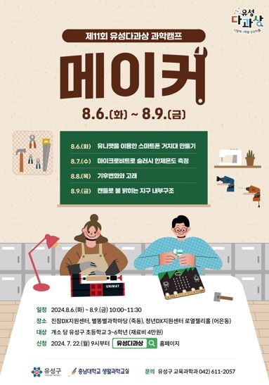 정용래 유성구청장은 “여름 방학을 맞아 아이들에게 재미있고 유익한 과학캠프를 준비했다”며 “이번 캠프를 통해 학생들이 메이커 활동을 즐기며 기후변화에 대해 깊이 이해하고, 창의력과 과학적 사고력을 키울 수 있기를 기대한다”고 말했다.