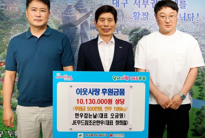 (아름다운교육신문) 대구 달서구가 19일 한우잡는날, JE푸드참조은한우로부터 관내 취약계층 주민들에게 지원해달라며, 이웃사랑 후원금품 1,013만원을 기탁받았다