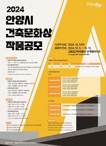 (아름다운교육신문) 안양시는 ‘2024년 안양시 건축문화상’에 참여할 작품을 공개 모집한다고 20일 밝혔다.