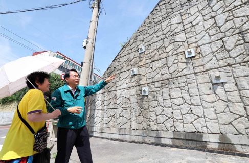 김찬진 청장은 최근 정밀안전진단 결과에 따라 단면·표면 보수, 어스앵커와 낙석방지망 설치 등의 보수·보강공사를 완료한 송현누리아파트 옹벽을 점검했다. 또 이번 장마로 인해 수목이 전도된 송현근린공원을 찾아 조치 상황을 확인했다.