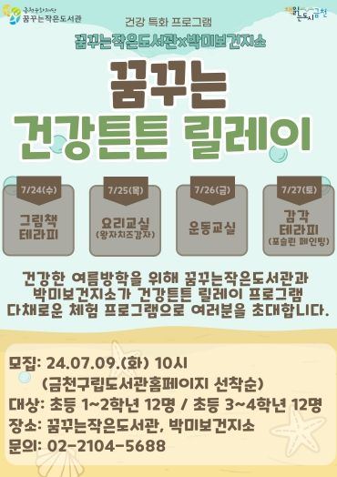(아름다운교육신문) 금천구는 여름방학 어린이 건강 프로그램 ‘꿈꾸는 건강튼튼 릴레이’를 오는 24일부터 27일까지 진행한다고 밝혔다.
