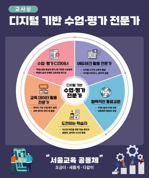 서울시교육청은 기술이 사람을 위해서 올바로 활용될 때 교육의 새로운 가능성을 열어줄 수 있다는 관점에서‘디지털 기반 수업·평가 전문가’교사상을 전국 최초로 개발하였다. 전문성을 갖춘 현장 교원 30여 명과 교육전문직원의 한 달여 간의 노력으로 구상된 이 교사상을 바탕으로 각 영역의 역량을 고르게 개발할 수 있도록 촘촘하고 체계적인 연수 과정을 설계하였다.