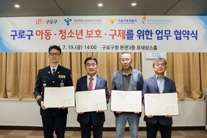 (아름다운교육신문) 구로구가 서울남부교육지원청, 구로경찰서, 한국도박문제예방치유원과 함께 아동‧청소년을 유해환경으로부터 보호하기 위한 업무협약을 7월 19일 구청 르네상스홀에서 체결했다.