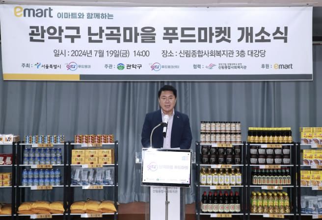 구는 지난 7월 19일 ㈜이마트의 후원으로 신림종합사회복지관에서 ‘난곡마을 푸드마켓’ 개소식을 진행했다. 개소식에는 박준희 관악구청장, 정기석 ㈜이마트 CSR팀 수석부장, 최성숙 신림종합사회복지관장, 김준혁 서울잇다 푸드뱅크센터장, 김지환 관악푸드뱅크마켓 센터장 등이 참석했다.
