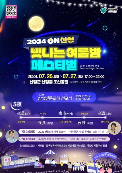 선포식을 시작으로 콘서트 ‘웰컴 투 산청’ 퓨전국악 그라나다 및 초대가수 린의 공연으로 산청의 여름밤 감성을 자극할 예정이다.