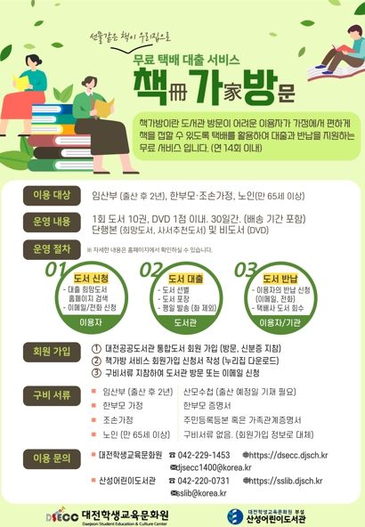 (아름다운교육신문) 대전학생교육문화원은 도서관에 직접 방문하기 어려운 독서 소외계층을 대상으로 택배를 활용해 무료로 대출‧반납을 해주는 ‘책가방’ 서비스를 2024년 상반기에 이어 하반기에도 지속 운영한다고 밝혔다.